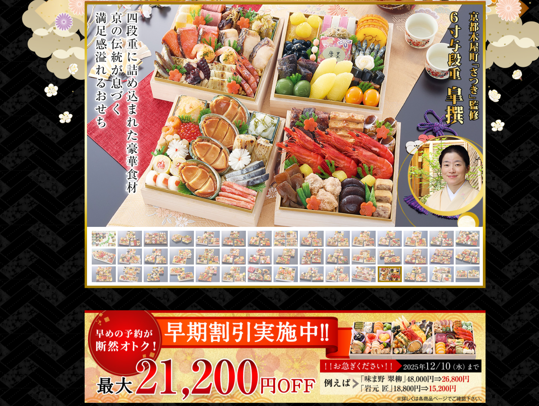 【PR】匠本舗 今回ご紹介するのは、料亭のおせち料理販売サイトです♪全国の料亭に監修頂いた料亭おせちです! 今年は監修料亭26屋号、50種、【約75万個以上】のおせちを販売予定☆早期注文するほど安く買える『早割り』を実施しており、期日を過ぎると価格がアップしていきます。早割り終了期限12月10日!! 販売期間は8〜12月中旬頃(売り切れ次第終了)となります。また、11月以降は更に11種のおせちを追加で販売を予定されています。 詳細はこちらをクリック おすすめ商品 京都祇園 料亭「岩元」 極 早割価格:27,800円 圧倒的ボリュームの『極』ですがただ量が多いだけでなく、74品目もの多彩なお料理が楽しめる内容で、中には『極』でしか食べられないお料理がいくつも盛り込まれています。 舩森大漁船早割価格:29,500円 白木製の特大舟形重に、厳選した54品を豪快に盛り込みました。数の子や海老艶煮といったおせちの定番料理はしっかり押さえつつ、林シェフのアイデアが光る創作メニューも多数。 こだわり 商材名 匠本舗運営者 T.N※当サイトはアフィリエイトプログラムを利用し宣伝目的で作成しております。