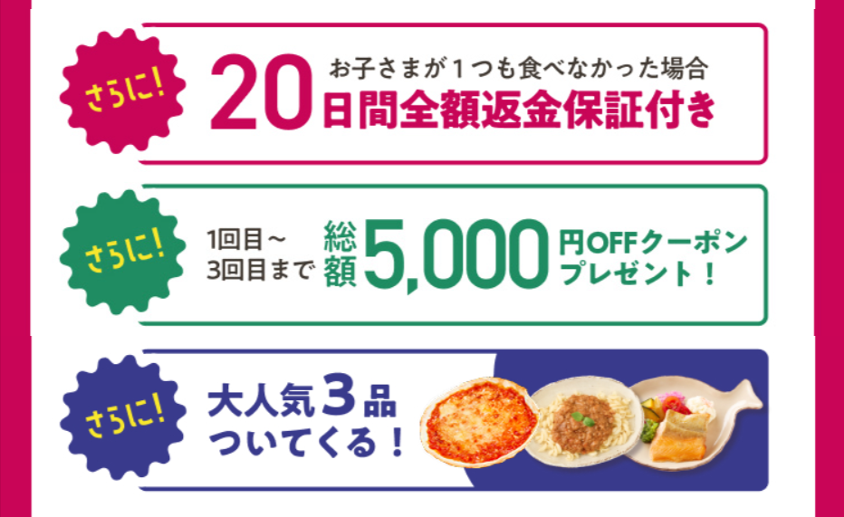 【PR】モグモ 今回ご紹介するのは食卓の悩みがなくなる!冷凍幼児食を販売しているサイトです♪☆おすすめポイント☆・管理栄養士が監修し、幼児期に必要な栄養素をカバー! ・無添加のメニューが9割以上! ・冷凍で届くので、レンジで温めるだけ!手間いらずに時短できる! ・子どもも喜ぶかわいいパッケージで商品をお届けされます! ・希望のお届け周期や食数を選べる!☆こんな方におすすめ☆・1歳半〜6歳の子どもがいるママ・ワーキングママ・育児で家事と仕事の両立が大変で、自分の時間がなかなか取れないママ ・忙しいので時短ニーズが高いが、子どもの食事に手を抜きたくない・本当は自分の手で頑張って作りたいけど、毎食手間をかけて作る時間がない、、、 →独自の冷凍技術で長期間保存できる・月齢に合わせた食事が難しい、、、 →管理栄養士が無料で相談サポートしてくれます・市販の食事に罪悪感や抵抗感がある 詳細はこちらをクリック はじめてセットキャンペーン 冷凍無添加幼児食8食セット 2,980円(税込) 管理栄養士監修のもと、素材の味、栄養バランス、食品の衛生管理を担保するための仕組み作りに力をいれられています!子育てあるあるな、お迎えが遅くなった!病院混んでた!寝過ごした!そんなときのご飯のお守りにもなりそうですね☆ どんなメニューがあるの? 商材名 モグモ運営者 T.N※当サイトはアフィリエイトプログラムを利用し宣伝目的で作成しております。